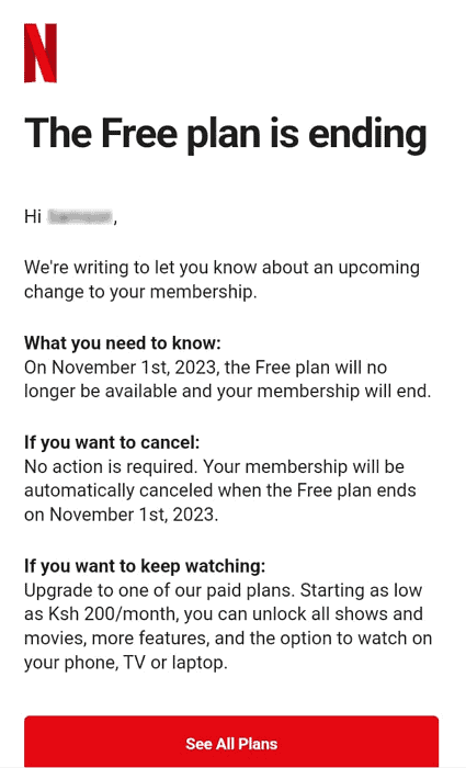 Netflix announced that when the free plan ends, all free accounts in Kenya will be deleted from Netflix’s database.
